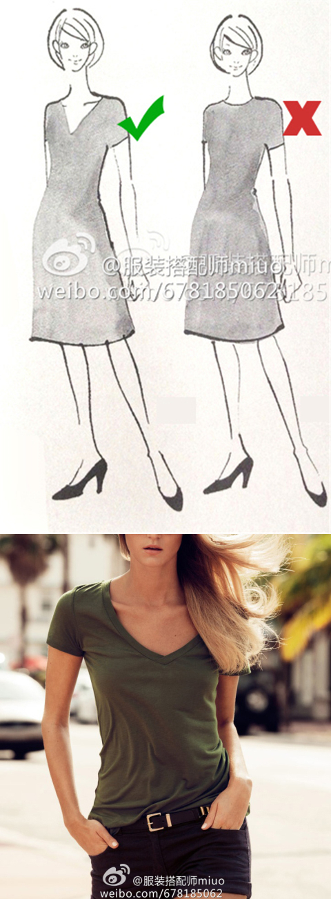 还记得我之前说过:斜直线会有显瘦的效果吗?所以,深深的大V领,很适合肩宽的人。深深的V型领有使上半身显瘦的作用!