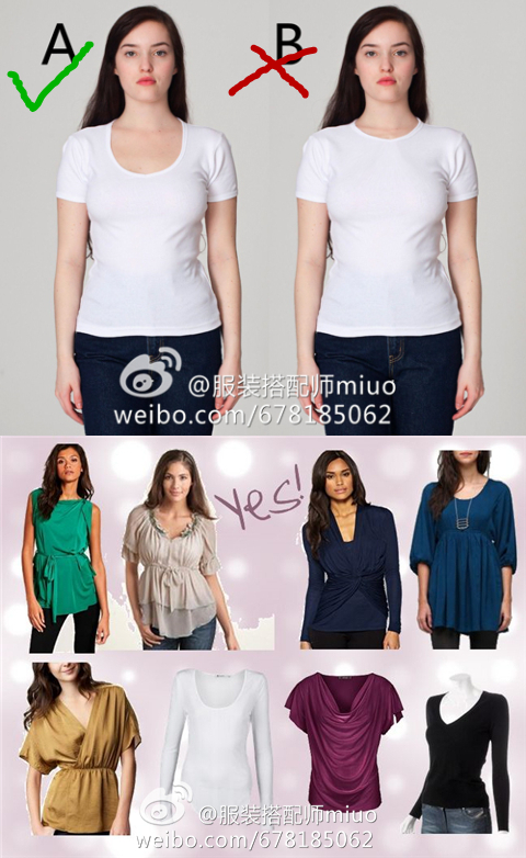 这里注意的是,U型领不是圆领。U型领比圆领要更深。深而长的U型领使锁骨及胸部以上的肌肤裸露,可以让颈部看上去修长,而肩部也自然就看起来变窄了。