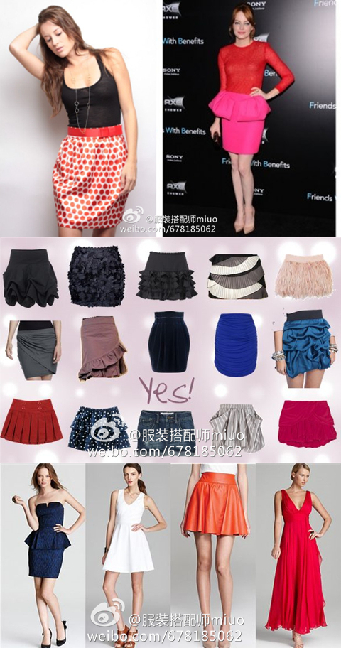 还可以穿有膨胀感的裙型,如蓬蓬裙、A型短裙、大图案的半身裙、超短的、上面有褶皱、大口袋等装饰的包臀裙,而不用担心臀部会显大。(但这些款式梨型身材则要避免)