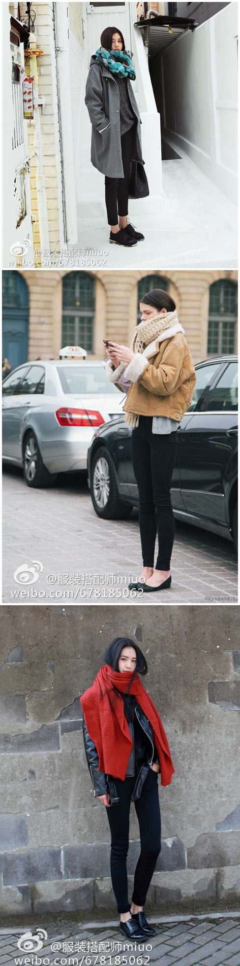 下面两身身搭配中,模特穿着颜色很暗,她配的是驼色和灰色围巾,这中性基础色能给人比较稳重低调内敛的感觉。而如果你想表现的甜美一点,不妨试试桃红色、粉红色、波点图案等元素的围巾。