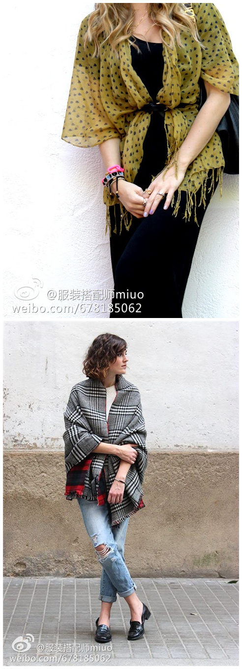 大围巾可以用来做披肩。而且还可以利用腰带,把围巾像开衫一样“穿”在身上。