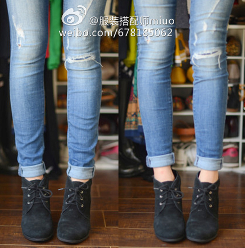看下图:同样的小靴口踝靴、同样的牛仔裤、同样的卷法,只是把裤脚稍微拉高了一点、露出来脚脖子和脚踝间最细的那一段,这样看起来就舒服很多很多!小腿也显细了、腿部显得更利落