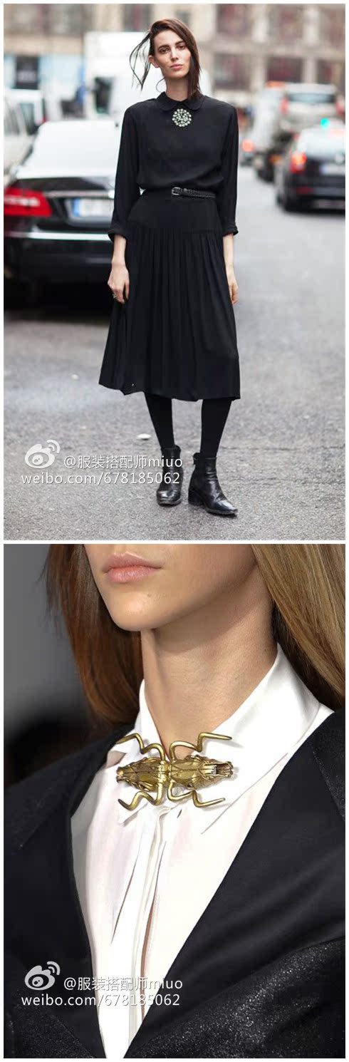 胸针别在领口中央,可以替代项链作为整体搭配视觉重心的作用。如果你喜欢穿彼得潘领的衣服、穿衬衫喜欢把扣子全部扣上,那么你就可以试试在领子中央别一个胸针,会看起来很复古、很有味道。