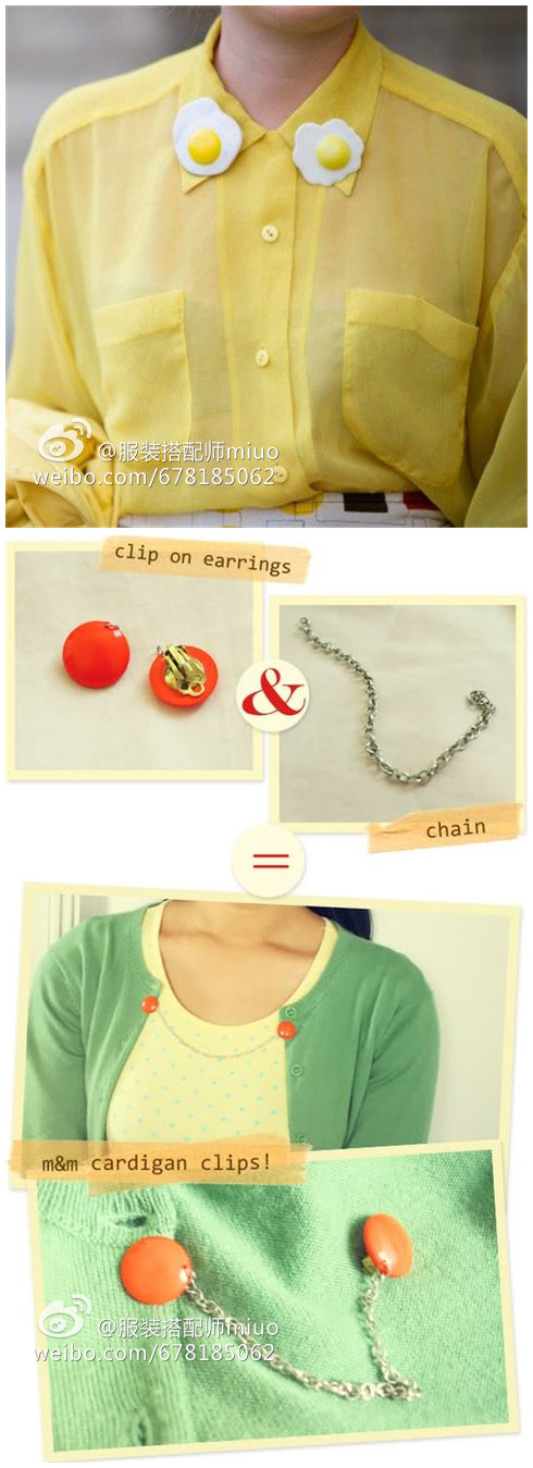 普通的衬衫,在领子上别两个荷包蛋型的小胸针,别致无敌!如果你换成不同的胸针,就会有全然不同的感觉。