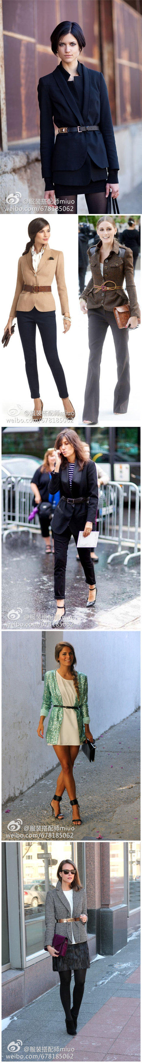 把腰带系小西装外面,这个做法非常时髦。如果你想破解小西装穿起来古板、老气的感觉,那么就可以试试在外面系根腰带!