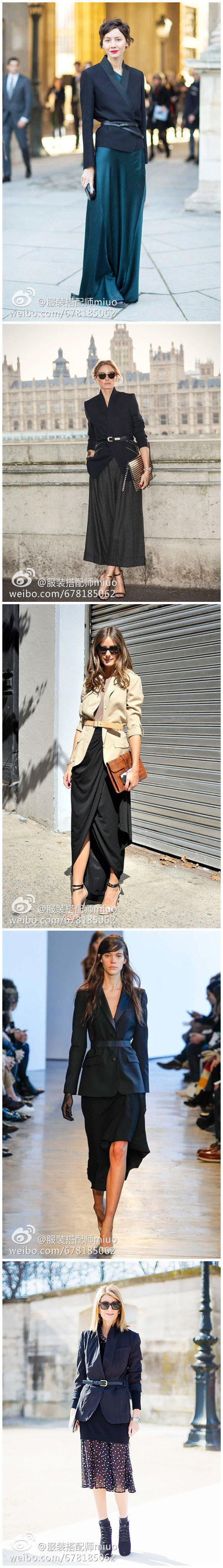 小西装配长裙、中裙,高腰处系根腰带,拉长下半身线条效果很无敌!而且显得时尚又优雅。