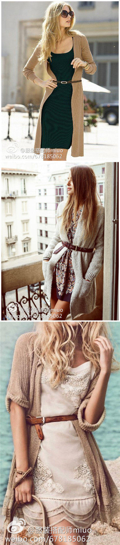 短款开衫+连衣裙,可以在外面系腰带,那么长款开衫+连衣裙,就更加可以这么做了。