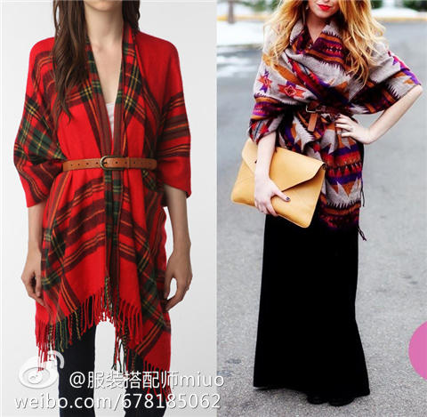 秋冬季的大围巾大披肩,可以结合一根腰带,像下图这样“穿”在身上,效果类似于斗篷~