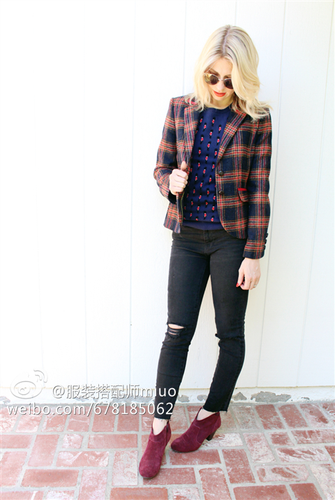 然后,因为上半身外套是花色、内搭针织衫也是花色,所以下装就要简洁点。而黑色九分裤,本身就是超级百搭的基础款基础色,永远也不出错。脚上穿V口踝靴,露出一点脚脖子,显得腿部利落有范。而鞋子是红色,也正好与上半身的红色西装呼应。