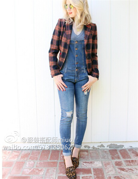 背带牛仔裤外穿格子西装。牛仔背带裤容易显得“不成熟”,对于一些三十多岁的女性,可能就怕显得不稳重了。但是如果你在背带裤外面套件西装,小西装的成熟稳重感,就能帮你弱化背带裤的休闲感。