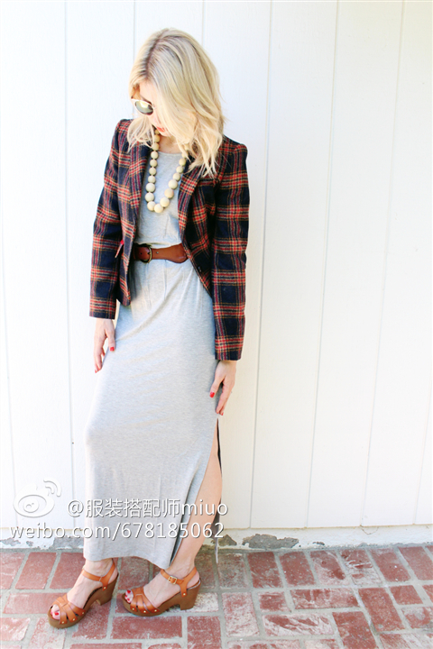 第六套搭配和第七套搭配,其实是一样的。基础款灰色T恤裙,扎个腰带定位腰线,外面套格子西装,只是裙子长短的区别。而灰色本身就是中性基础色,很百搭,与红+藏蓝的西装配一起,完全没问题。