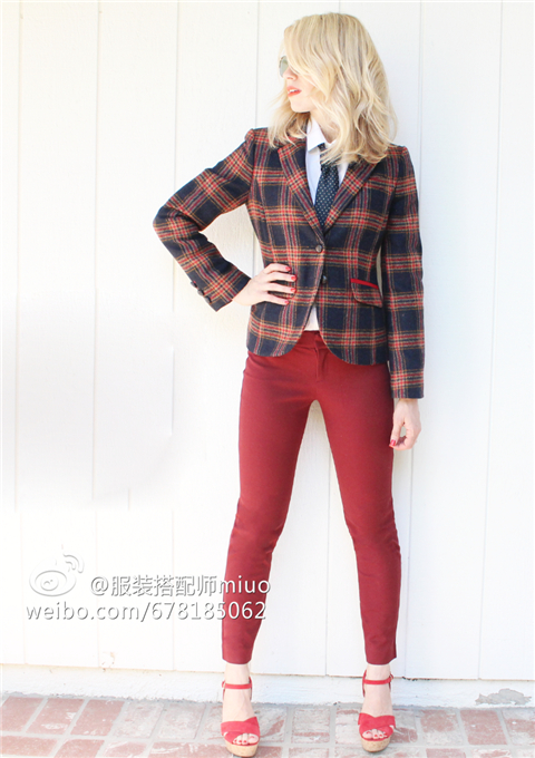 首先,我们来看看这件格子小西装的主要颜色,是由藏蓝和红色组成的。所以,第一套搭配中,模特内搭选用了同样是由藏蓝和红色的套头针织衫(针织衫的藏蓝是比较浅的藏蓝),虽然两者都是花色,但看起来也不违和,颜色也稳重。