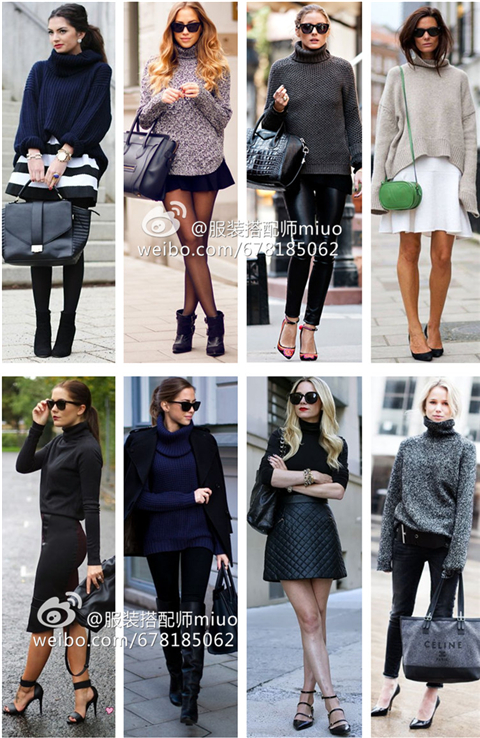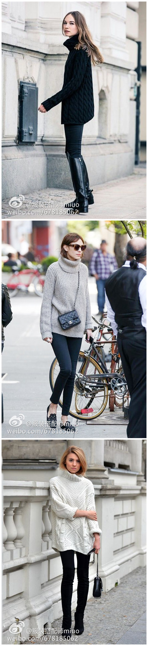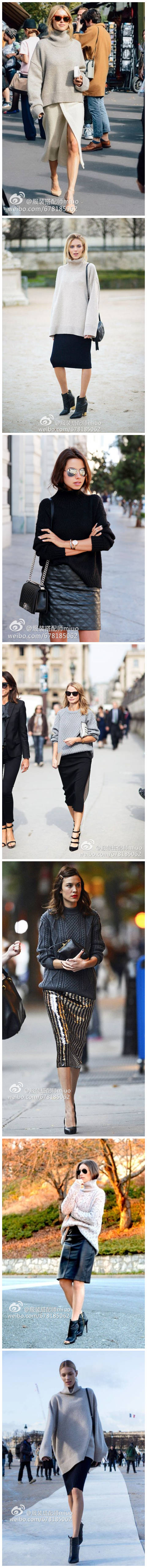 宽松的高领毛衣+一步裙/铅笔中裙,几乎就是个定番,街拍中出镜率极高。人不高的建议选择高跟鞋高跟踝靴。人高的可以直接配尖头