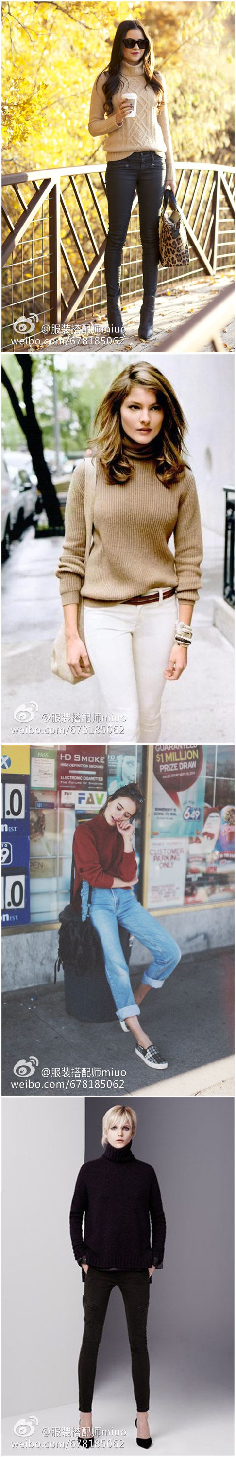 宽松的高领毛衣,搭配的重点就是遵循“上宽下紧”的法则。