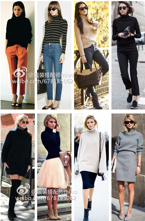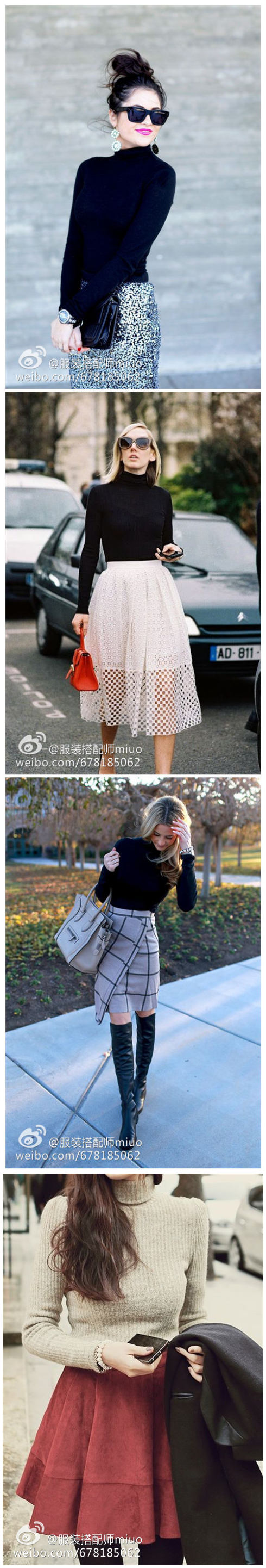 修身贴身款的高领衫,在欧美街拍中最常见的组合,就是搭配半身裙,上衣下摆塞腰头。腿上配高跟鞋或者长靴。