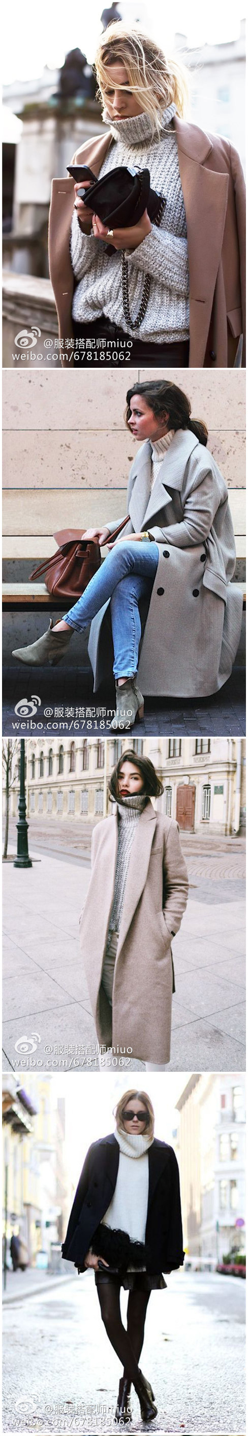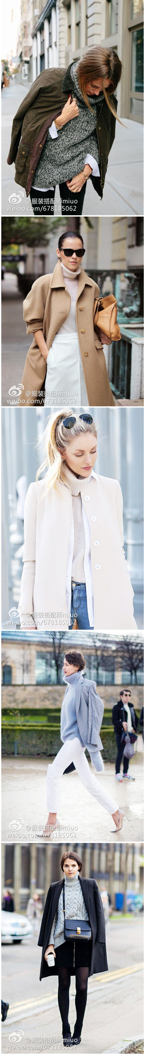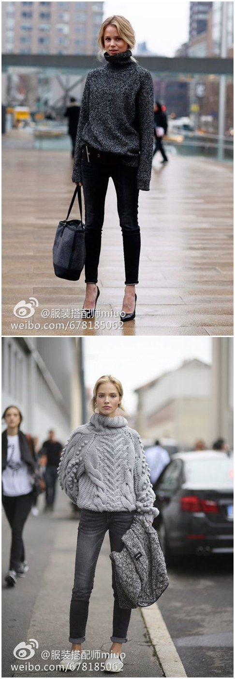 首先我想大家也能感觉到,街拍中所出现的高领毛衣,大多数是黑色、白色、灰色系。还有一些是藏蓝、驼色、墨绿等中性色,而