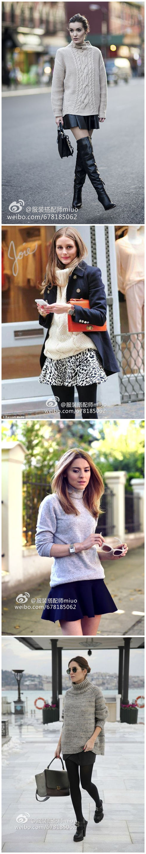 宽松的高领毛衣,搭配短裙,腿上穿连裤袜、或者配长靴,也是一个固定组合一一其实就是变相的“上宽下紧”。因为你穿短裙,展露了腿部线条。