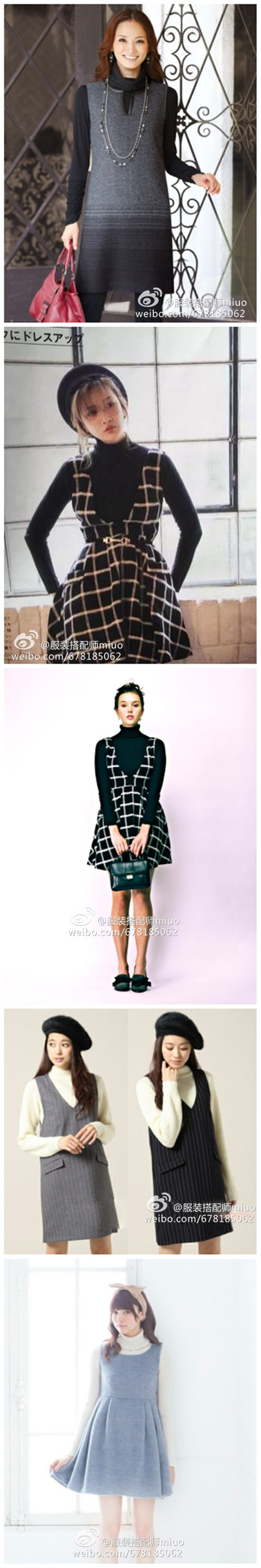 最近天气冷了,遇到好几个童鞋都问我毛呢背心裙里面该搭什么?其实贴身的高领针织衫+厚厚背心裙,是个定番组合,在日韩系的搭配中出镜率极高。