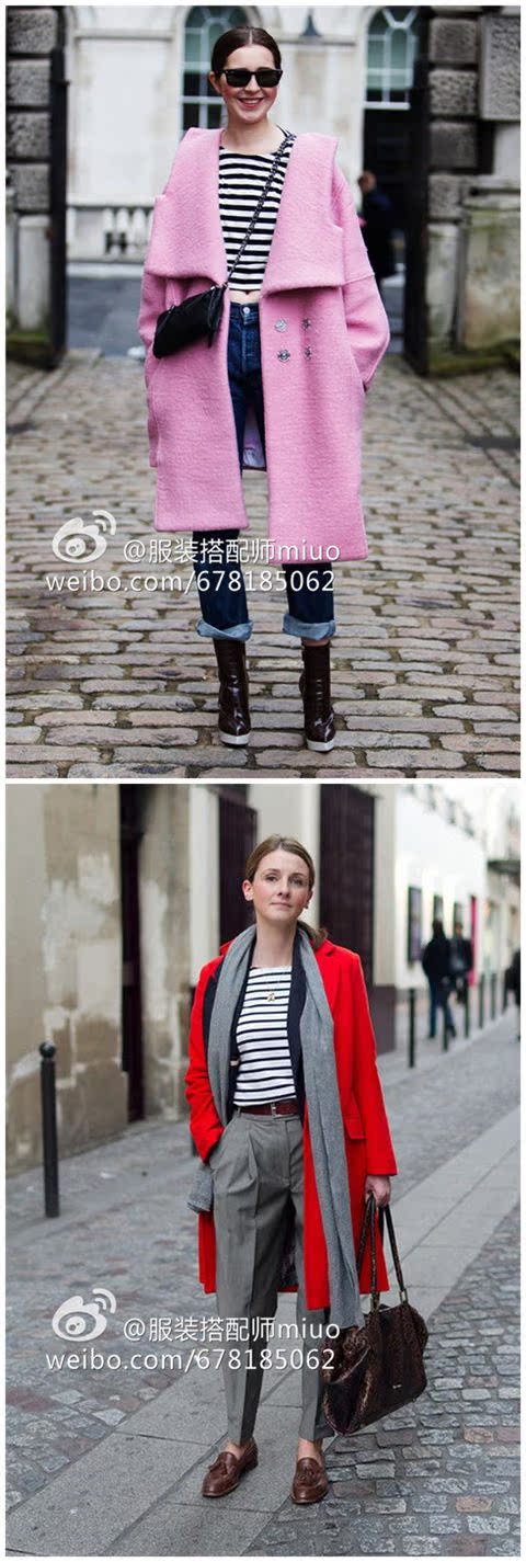 假设你穿了件桃红色的大衣,内搭一件纯黑色的毛衣,可能效果也就中规中矩,但是如果你试着搭配一件白色+黑色条纹的针织衫,这样的色彩组合就会很出挑!不信你可以自己试试。我鼓励大家多做实践和尝试。