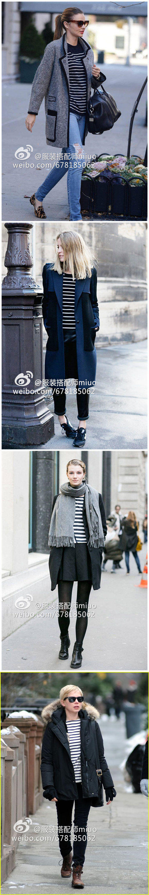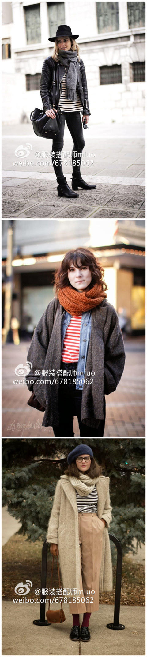 另外,除了佩戴项链和围巾,你还可以通过“叠穿混搭”的方式,来加强整体搭配的层次感。而所谓叠穿,就是像下图中那样:最里面T恤,外面一层较薄的开衫,再外面一层厚大衣......具体叠穿几层没有规定,但要保证三层以上,才会出现层次感。(当然,这个方法,不仅只限于条纹,其他元素的衣服也可以尝试)