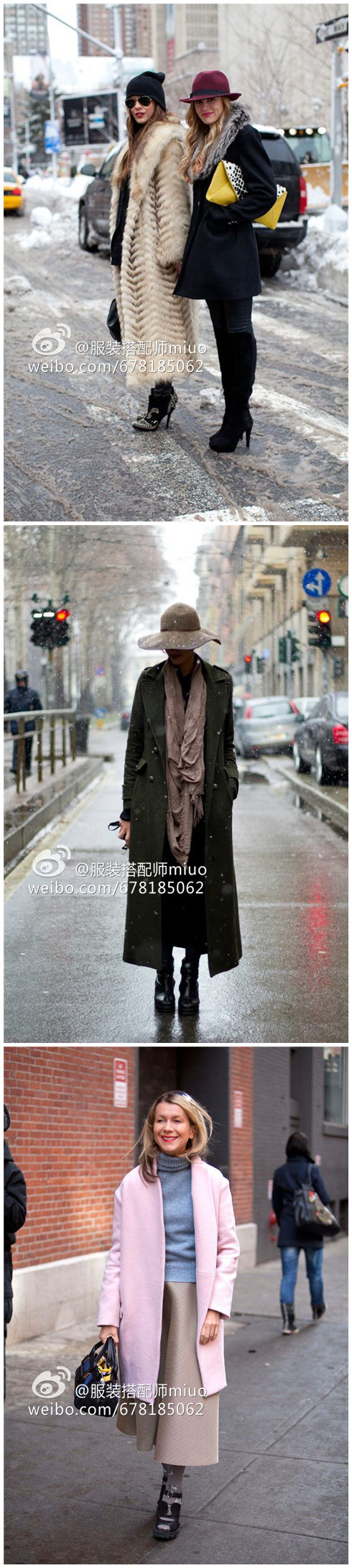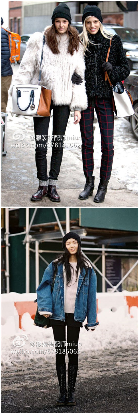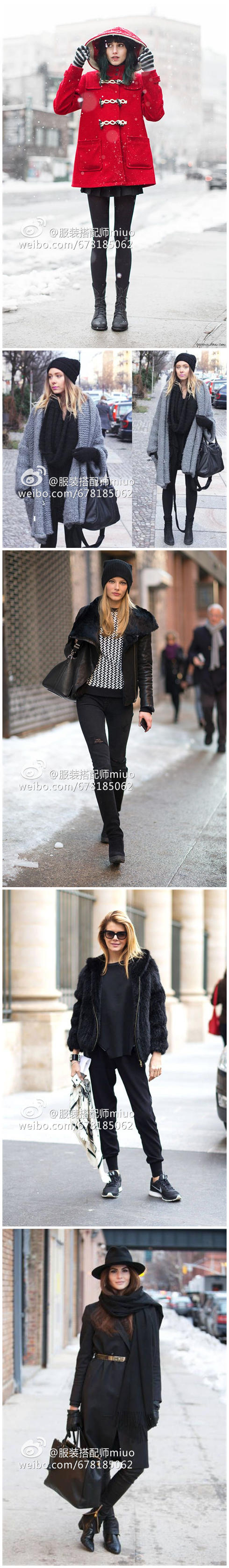 像下面两张街拍中,冰天雪地,范儿都可以露脚趾、露脚踝脚背,爱美之心膨胀起来,就不怕冷了。当然,我并不是让大家都这样穿,只是给各位做参考,如果你怕冷,就黑色裤子+黑色高跟鞋/靴吧。