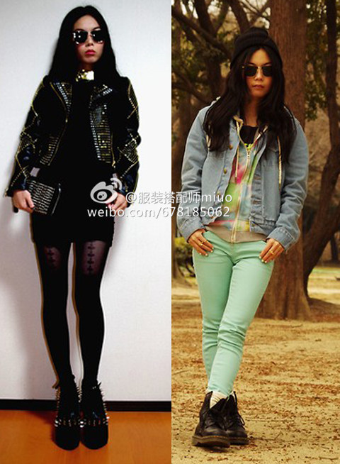 看下图:图中左右两边是同一个人,这个模特比较矮、腿也比较短,她穿大头马丁踝靴就显得腿更短了,但是穿上黑色高跟鞋+黑色连裤袜,美腿就出现了。