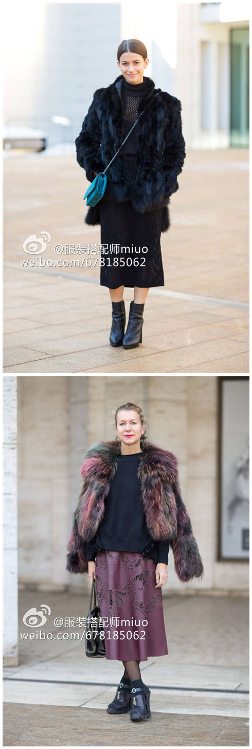 羽绒服、皮草等要配裙子,可以配一步裙、铅笔裙、有垂感的百褶中裙等。依然建议搭配高跟鞋。如果可以,甚至最好把头发也盘起来或掖到耳后。因为把脸庞和脖颈露出来能让头显小,而头小能显全身比例好,尤其是当你穿着膨胀感的冬装时,有显高显瘦的作用。