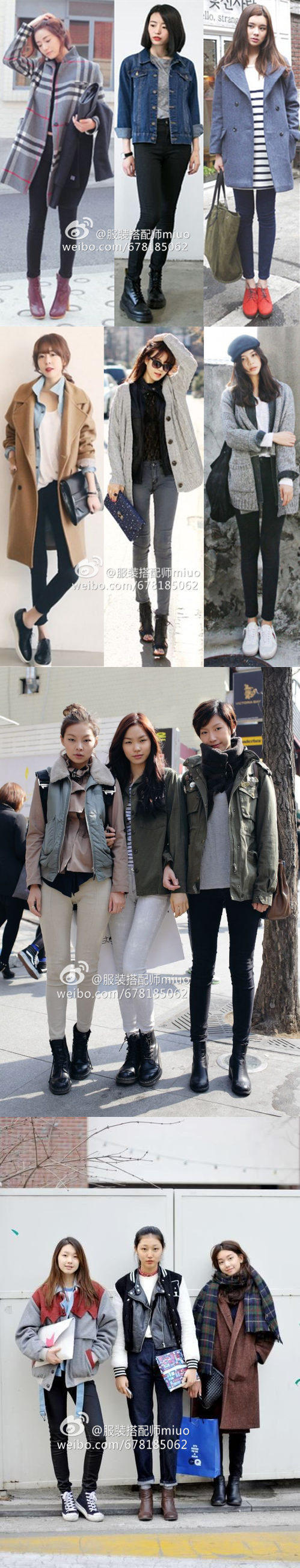 韩系街拍中很常见弹力包臀裙裤,还有卫衣等单品。