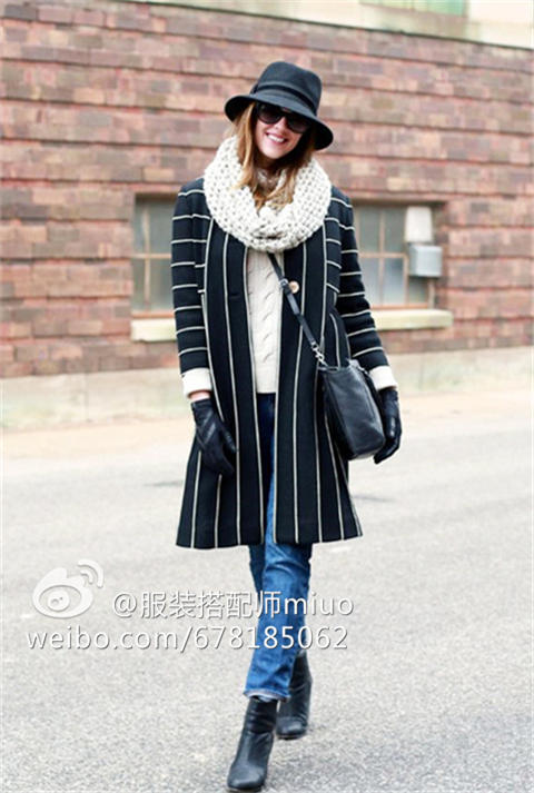 下面这身搭配中,围脖配的很好。因为大衣上的纵向条纹,会让上半身显得比下半身长。而搭配一根围脖。让视觉重心集中在颈部。就不容易让视觉感下沉。另外,注意模特的裤脚。穿踝靴时卷起裤脚,能让腿部显得利落。