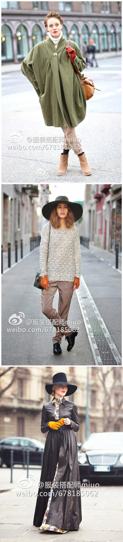 像下面这身搭配中,手套和半裙的颜色相呼应,大家可以把手套遮掉,再感受下整体搭配的效果,会不会就差了很多?会觉得那海藻绿的半裙在模特上半身全是大地色系的情况下,显得“势单力薄”。此时戴上一副同样绿色的手套,色彩感觉就平衡了。