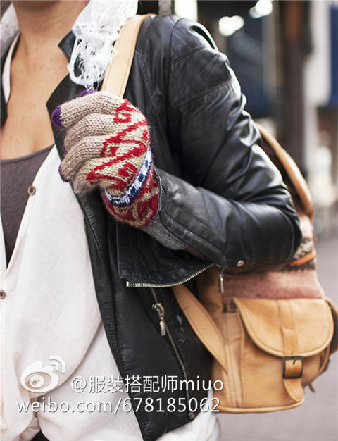 像皮衣这样容易显成熟的单品,可以搭配一副玩味感的针织手套,来弱化那种过于强势的感觉。