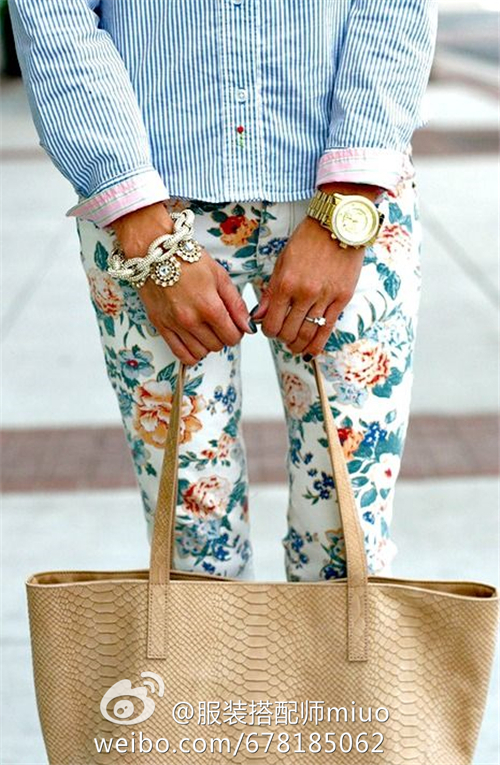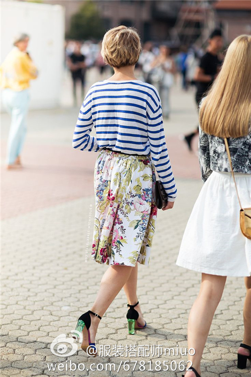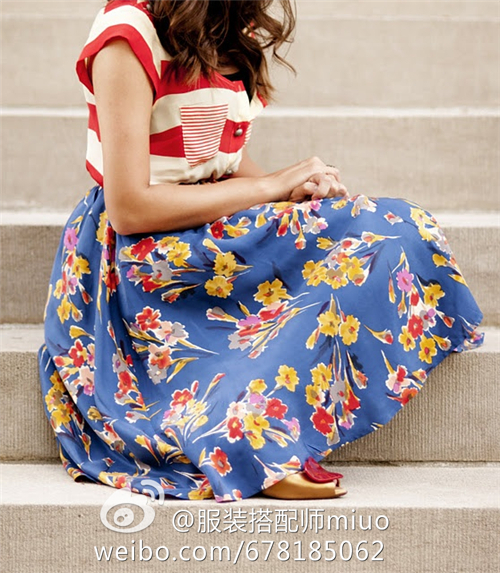 也可以搭配条纹!花朵图案和条纹搭配起来,感觉很清新。自然减龄!