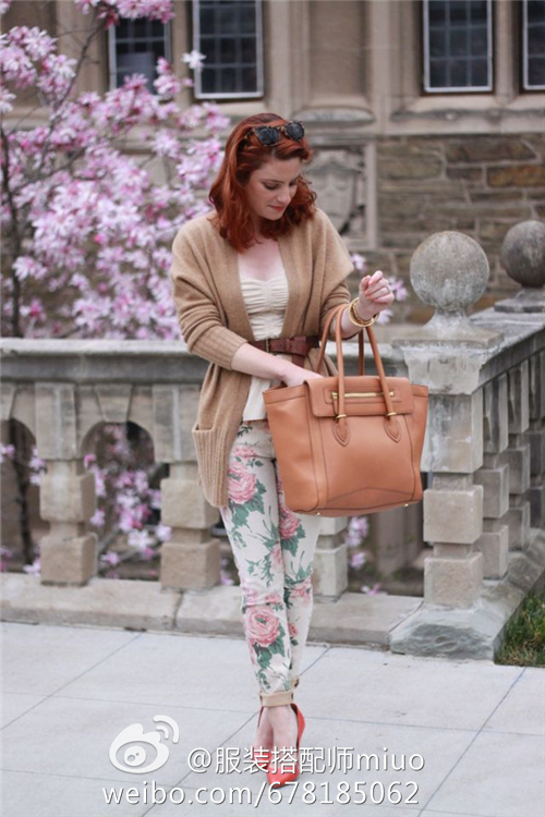 还有一些很百搭的中性基础色,可以与各种色调的花朵图案搭配。比如驼色、米色、卡其色、棕色、军绿、藏蓝、咖啡色等等等。下图中,浅色的花朵图案搭配大地色系的开衫、包包感觉很不错。