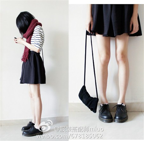 下图中,条纹T恤+黑色半裙,略显素然,所以加一根酒红色围巾,就很文艺范儿!