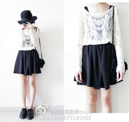 下图中的搭配,虽然只有黑白两色,但是外搭是透明蕾丝材质,显得特别精致有情调。而头上的黑色小礼帽,也增添了街拍时尚感。