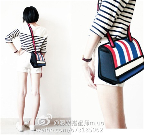 下图中,白色短款+条纹T+白色鞋子,太单调了,但是配上一个法国国旗色的包包,就感觉充满活力!