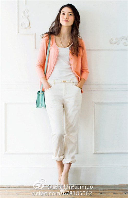 下图中,橘粉色针织开衫,加上薄荷绿的包包,是春天的颜色,但是内搭的背心、裤子、鞋子,都是中性基础色。