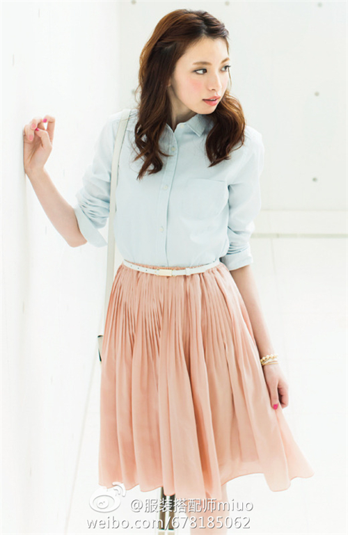 下面是两种淡淡的春季的春天的色彩组合。但是模特腰间系了白色腰带。那白色的腰带是作为淡蓝色衬衫和裸粉色半裙的色彩过渡。还有大家注意模特的指甲,是鲜艳的红色。这种小小的细节感,你可能很少注意,但是如果放在整体搭配中,呈现在他人视觉里、或者照片上,有和没有,会感觉大大的不一样。