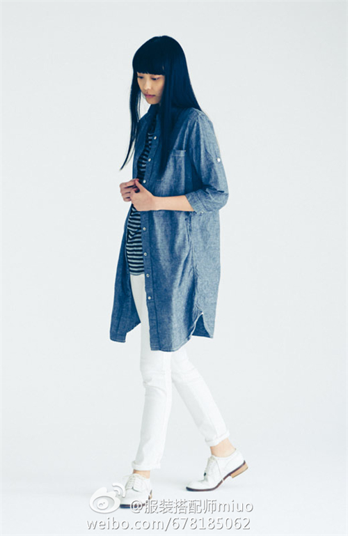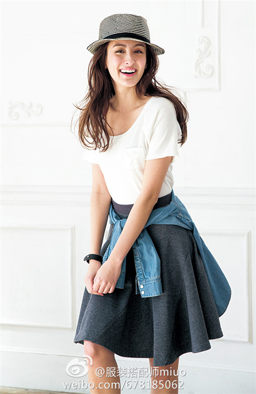 下图中也一样。如果仅仅只是白色T恤+灰色半裙的话,未免太无聊了。配上一件牛仔衬衫,颜色干干净净,也不会太单调。牛仔衬衫可以穿身上,也可以系在腰间,当做一种装饰,很有范儿。
