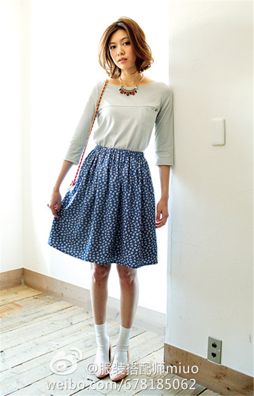 下图中,本来挺普通的,就是T恤+松紧带的碎花半裙。但是模特穿了粉色高跟鞋配白袜子,这种搭配很少女气质!这样搭后立刻减龄!再在脖子上配根精美项链,发型和妆容也打理下,这样子的搭配也已经很甜美!