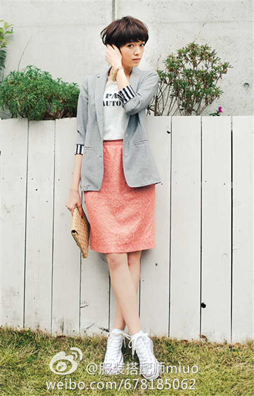 就比如下图中,浅灰色的西装,内搭白色字母T恤,然后配上橘粉色半裙和帆布鞋,既休闲、又成熟、很适合大学女生和刚毕业参加工作的女孩。在这里,浅灰色、白色,都是中性基础色,而橘粉色,就是很春季感觉的糖果色。它们组合在一起,既有春季的清新甜美感,又有稳重的气质。