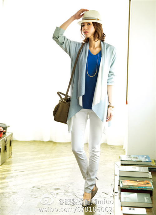 下面也是:开衫、裤子、包包、鞋子,都是中性基础色,唯独内搭是宝蓝色。春天的鲜艳色彩。