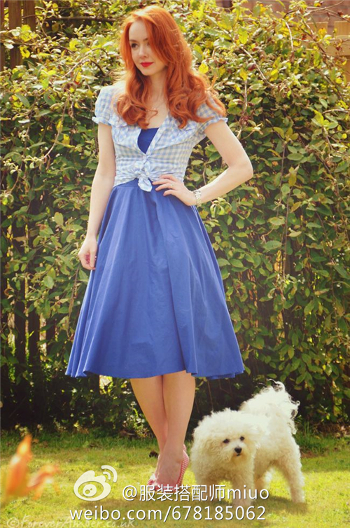 无袖的连衣裙会比有袖子的更有少女气息。如果你手臂粗的话,可以像下面这样,搭配一件衬衫,把衬衫下摆在高腰处打个结。(不过下面这套搭配中,模特穿的是高跟鞋,所以虽然有复古的感觉,可是却显得比较成熟。若换成平底鞋,则气场就会减弱很多,显得更亲切)