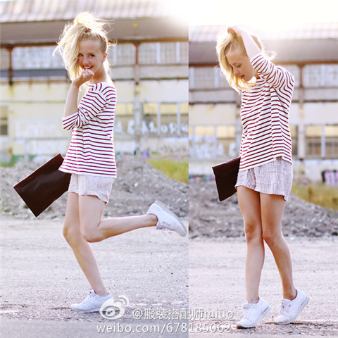 基础款的条纹T恤,搭配基础款的短热裤,再加上基础款的白球鞋。亮点是模特的发型,她梳了个很活泼的发型,显得俏皮可爱。