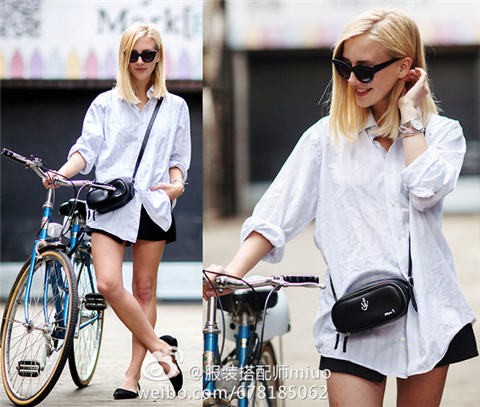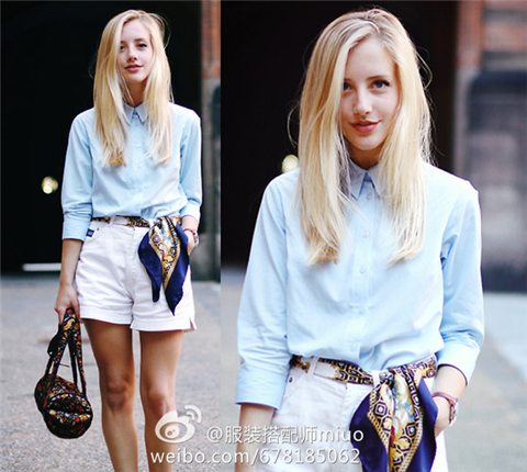 下面这身,基础款的淡蓝色衬衫,搭配基础款白色短裤,在腰间系的不是一般的皮带,而是一根爱马仕风格的丝巾,非常有感觉。