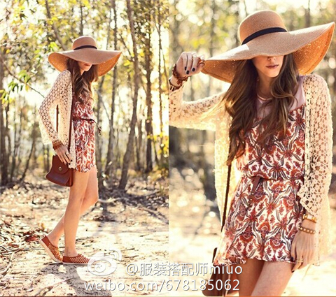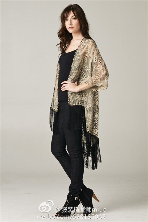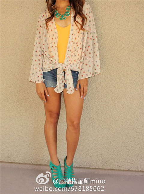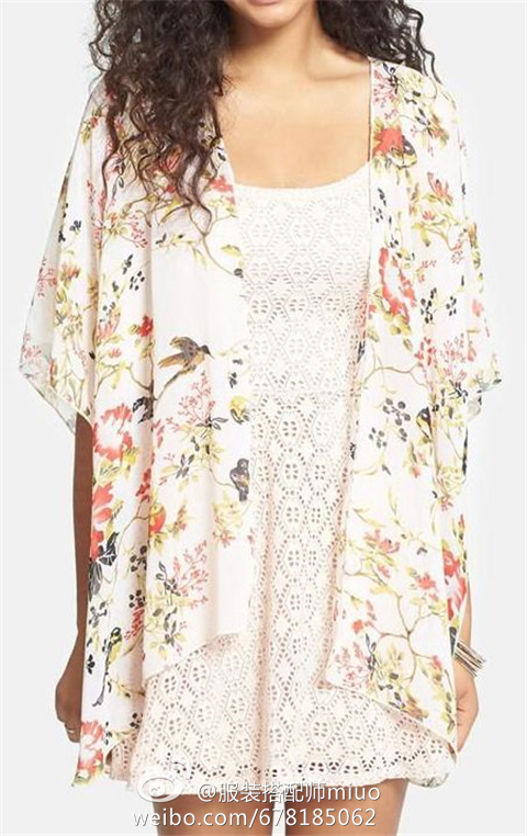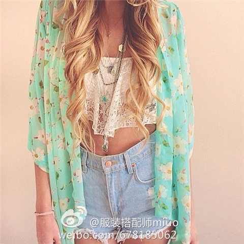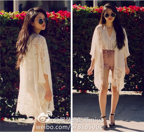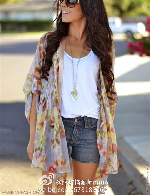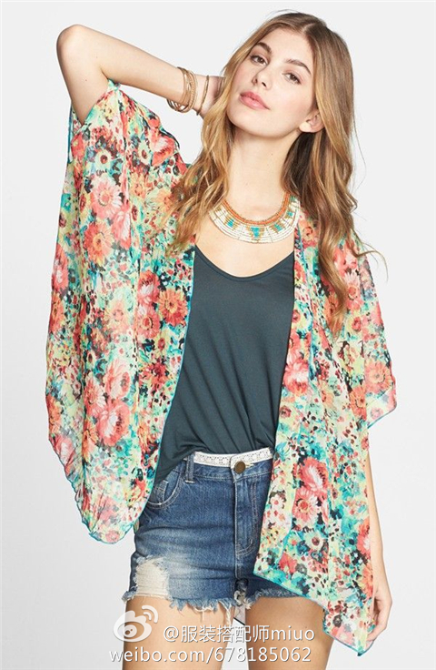 近年来非常流行的宽松雪纺开衫,就像下图中这种,在杂志和街拍中出镜率相当高。这种款式的雪纺开衫,有一个非常经典的“定番组合”,那就是:背心+项链+牛仔热裤+罗马风格的凉鞋或短靴+雪纺开衫。