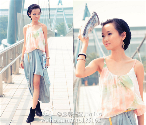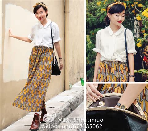 上面的搭配中,模特把刘海用发带束了起来,下面的搭配中,模特将刘海梳成了侧分,感觉很不同。