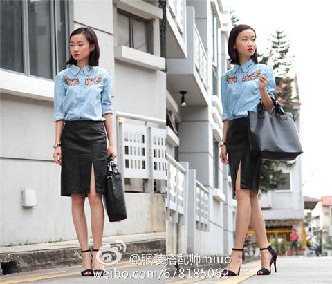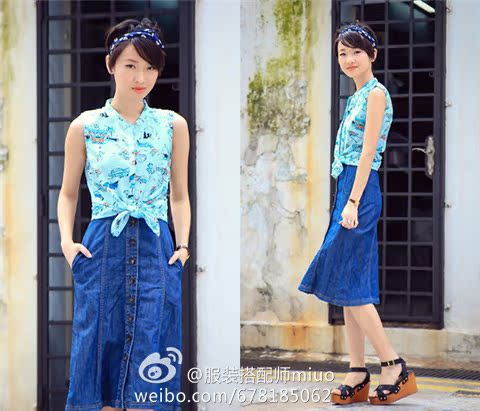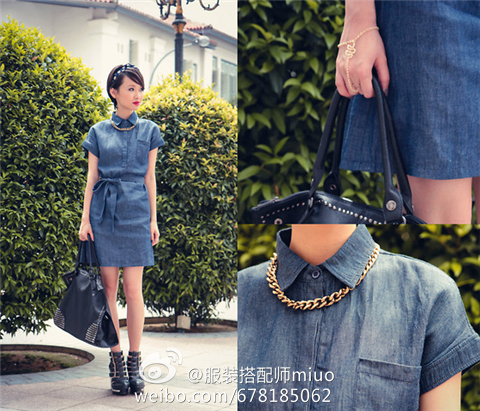 在这里顺便再提下:下图中,模特穿了一件牛仔衬衫式的连衣裙,因为把扣子一直系到了最上面,所以搭配一根项链,不仅能够起到“亮点”的作用,还能弱化衬衫领的压抑感。但是这种穿法只适合瘦人,上半身胖的人,穿衬衫时,建议敞开最上面的几颗扣子,露出锁骨。
