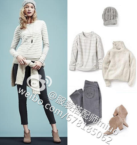 (帽子)+条纹T恤+(腰间系了件白色毛衣)+九分裤+踝靴,这套搭配中,帽子和系在腰间的白色毛衣,是可有可无的,有了增添整体搭配的时尚感,没有的话,最多就是很普通、没范儿了而已。