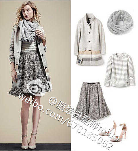(围巾)+条纹T恤+半身裙+高跟鞋,这一整套是自成一套的【垂直搭配】,这套配好后,你就可以考虑外面叠穿个什么样的外套了。